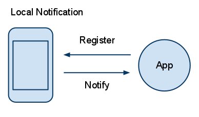 (1)Push Notification(プッシュ通知、リモート通知):サーバからユーザのデバイスに通知を行える。プロバイダ(Provider)と呼ばれるサーバ側の仕組みをサービス提供者が構築し、AppleのApple Push Notification Service(APNs)と通信する必要がある。providerとAPNsとの通信については別掲する。(2)Local Notification(ローカル通知):当該アプリが動作しているデバイスに限って通知を行える。